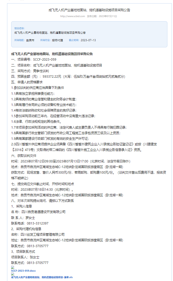 成飞无人机产业基地地面站、拖机道基础设施项目采购公告