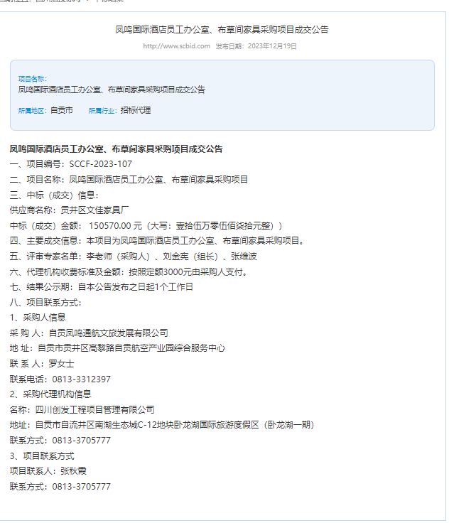 凤鸣国际酒店员工办公室、布草间家具采购项目成交公告