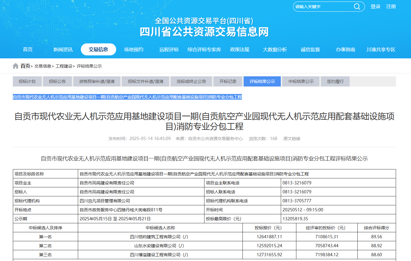 自贡市现代农业无人机示范应用基地建设项目一期(自贡航空产业园现代无人机示范应用配套基础设施项目)消防专业分包工程评标结果公示